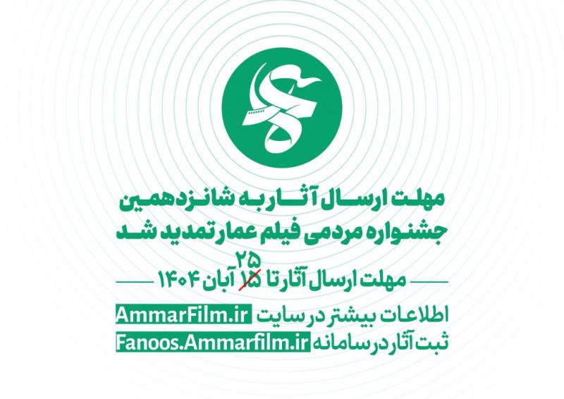 مهلت ارسال آثار به شانزدهمین جشنواره مردمی فیلم عمار که در 4 بخش، «رقابتی»، «فیلم ما»، «جوایز مردمی» و «اکران مردمی» برگزار میگردد تا تاریخ 25 آبان ماه تمدید شد.