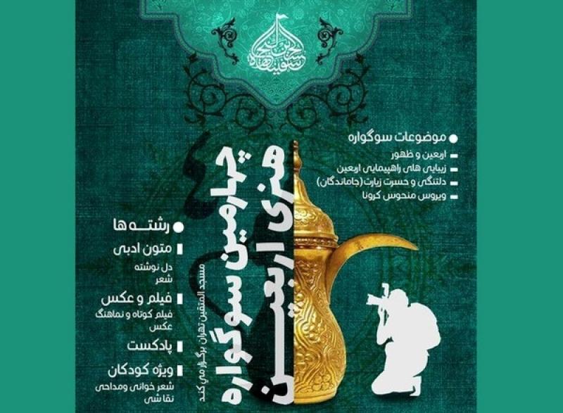 مهلت ارسال آثار به چهارمین سوگوارهی هنری اربعین که با هدف معرفی این رویداد جهانی به همت فرهنگسرای ارسباران و مسجدالمتقین تهران برگزار میشود، تمدید شد. این رویداد با هدف معرفی این رویداد جهانی و گره زدن آن با مسئلهی ظهور حضرت حجت (عجلاللهتعالیفرجهالشریف) به وسیلهی زبان رسای هنر و با موضوعات «اربعین و ظهور»، «زیباییهای راهپیمایی اربعین»، «دلتنگی و حسرت جاماندگان» و «ویروس کرونا» برگزار میشود.