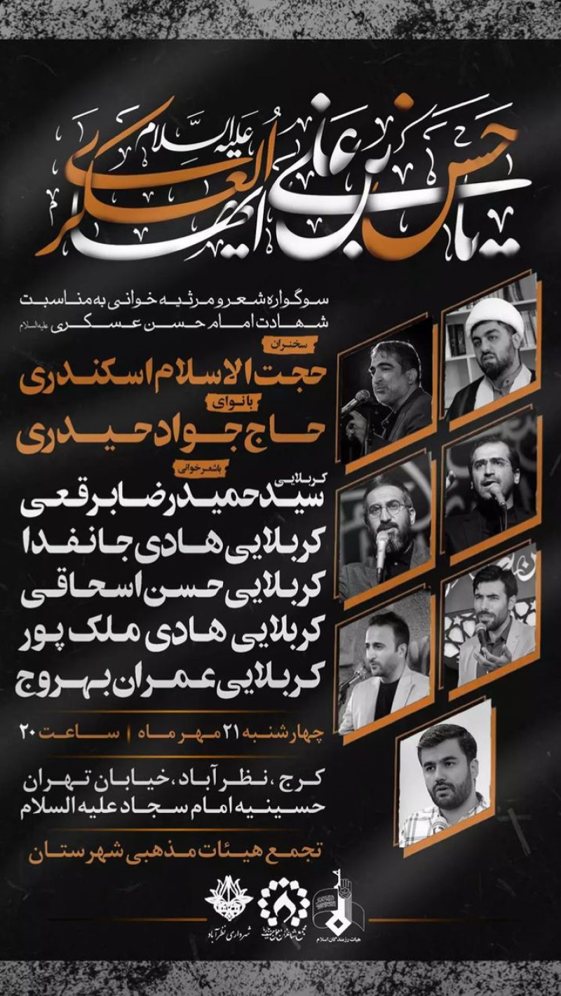 به همت مجمع شاعران اهل بیت (علیهالسلام) و با مشارکت هیأت رزمندگان اسلام و شهرداری نظرآباد و به مناسبت شهادت امام حسن عسکری (علیهالسلام)، سوگوارهی شعر و مرثیه در رثای آن امام همام در کرج برگزار میشود. در این مراسم «حجتالاسلام اسکندری»؛ سخنرانی و «جواد حیدری»؛ مرثیهخوانی خواهند کرد و «سیدحمیدرضا برقعی»، «هادی جانفدا»، «حسن اسحاقی»، «هادی ملکپور» و «عمران بهروج» شعرخوانی خواهند داشت.