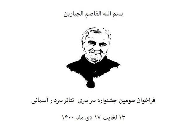 فراخوان سومین جشنوارهی سراسری تئاتر «سردارآسمانی» در سه بخش تئاتر خیابانی، نمایشنامهنویسی و رادیوتئاتر منتشر شد. این جشنواره با هدف گرامیداشت سپهبد شهید «حاج قاسم سلیمانی» و سرداران شهید جبههی مقاومت به همت انجمن تئاتر انقلاب و دفاع مقدس بنیاد فرهنگی روایت فتح و اداره کل فرهنگ و ارشاد اسلامی استان کرمان در تاریخ ۱۳ لغایت ۱۷ دیماه سالجاری و با دبیری «سیدوحید فخرموسوی» برگزار خواهد شد.