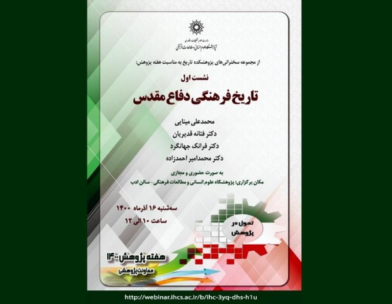 در ادامه مجموعه سخنرانیهای پژوهشکدهی تاریخ که بهمناسبت هفتهی پژوهش برگزار میشود، نشست «تاریخ فرهنگی دفاع مقدس» روز سهشنبه ۱۶ آذرماه برگزار میشود. این نشست با سخنرانی محمدعلی مینایی، فتانه قدیریان، فرانک جهانگرد و محمدامیر احمدزاده برگزار میشود.
