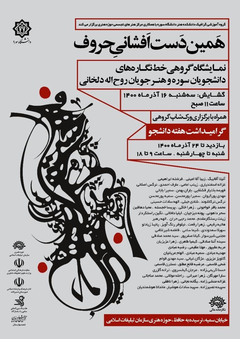 بنا براین گزارش، در راستای تکریم روز دانشجو، دانشکدهی هنر دانشگاه سوره در همکاری با مرکز هنرهای تجسمی حوزهی هنری انقلاب اسلامی، اقدام به برگزاری نمایشگاهی با عنوان «همین دست افشانیِ حروف» کرده است. در این نمایشگاه که به همت گروه گرافیک دانشگاه سوره برگزار میشود، بیش از ۱۰۰ اثر از خطنگارهها و نقاشیخطهای فارغالتحصیلان و دانشجویان دانشگاه سوره و هنرجویانِ استاد «روحاله دلخانی»؛ یکی از پیشکسوتان خوشنویسی به نمایش گذاشته خواهد شد.