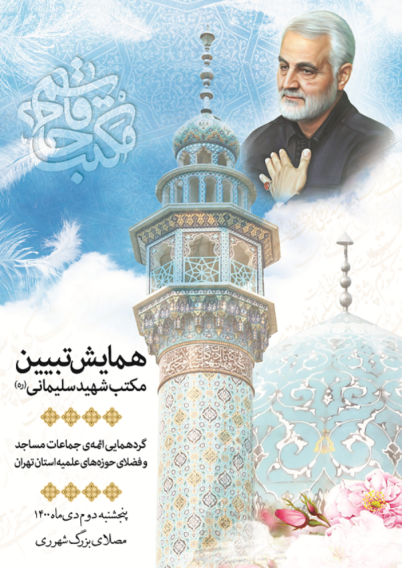 «همایش تبیین مکتب شهید سلیمانی» با همکاری مرکز رسیدگی به امور مساجد و دبیرخانهی ستاد برگزاری دومین سالگرد شهادت شهید سلیمانی و با هدف ترویج مکتب این شهید عزیز، با حضور ائمهی جماعات استان تهران، اساتید و فضلای حوزههای علمیه استان تهران برگزار خواهد شد.