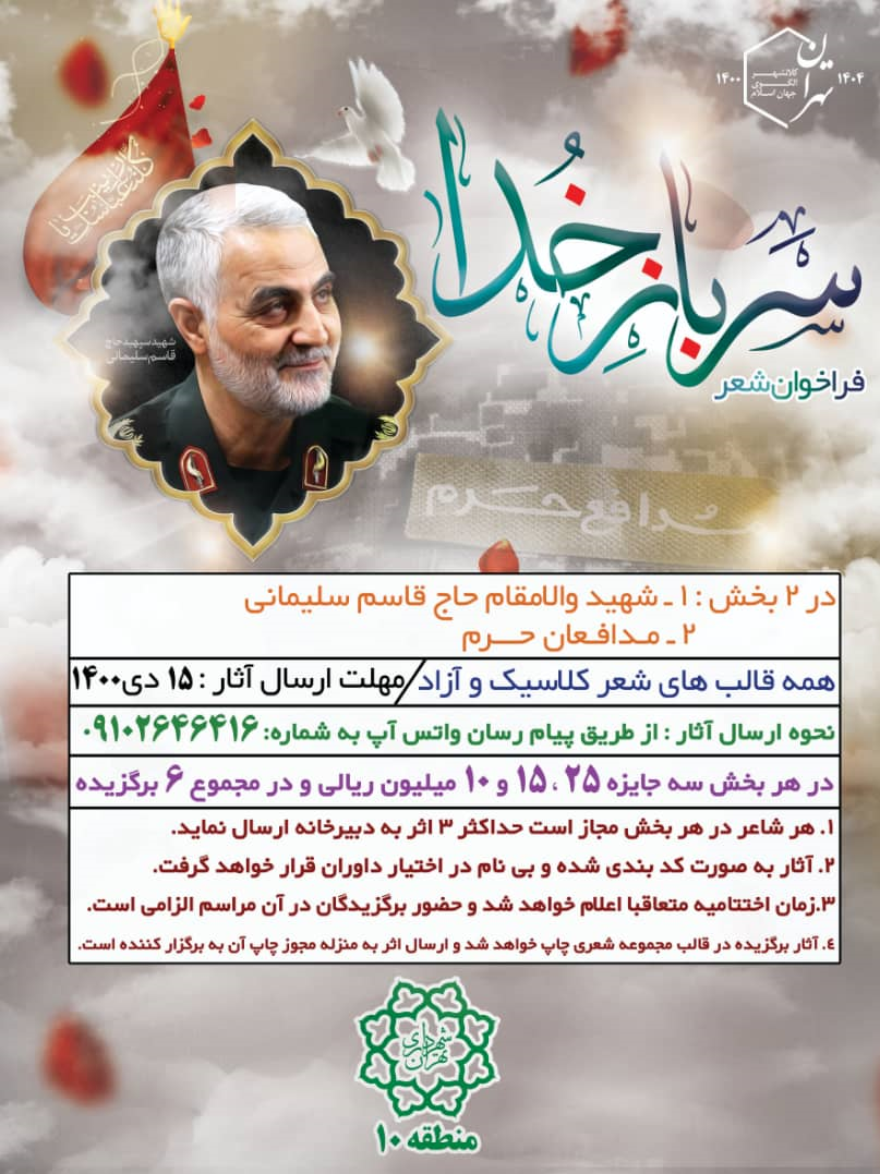 کنگره شعر «سرباز خدا» که به همت مجمع شاعران اهل بیت(ع) و شهرداری منطقه ۱۰ تهران برگزار میشود، برای دریافت آثار در ۲ بخش شهید والامقام حاج قاسم سلیمانی و مدافعان حرم در تمام قالبهای شعر کلاسیک و آزاد فراخوان داد.