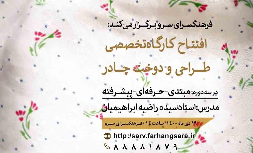 براساس این گزارش، فرهنگسرای سرو از کلیه دانشجویان و هنرجویان کشور دعوت میکند با حضور در این کارگاه تخصصی، آموزش طراحی و دوخت چادر را فرا بگیرند. مدرس این دوره سیده راضیه ابراهیمیان است.