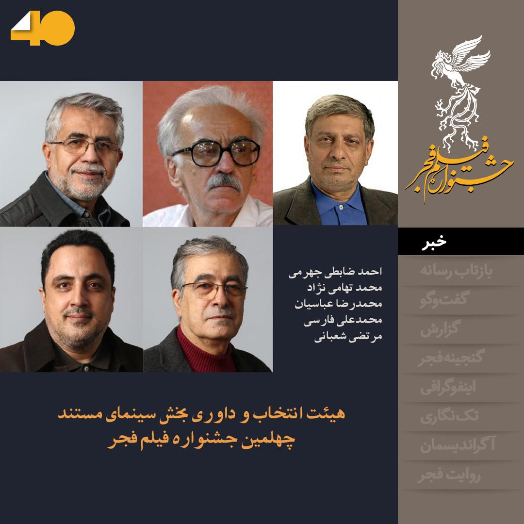 به گزارش ارتباطات و اطلاع رسانی مرکز گسترش سینمای مستند و تجربی، طی احکامی از سوی «مسعود نقاشزاده» دبیر چهلمین جشنواره فیلم فجر، دکتر «احمد ضابطیجهرمی» (نویسنده و استاد دانشگاه)، «محمد تهامینژاد» (پژوهشگر)، «محمدعلی فارسی» (مستندساز و تهیهکننده سینمای مستند)، «مرتضی شعبانی» (مستندساز) و «محمدرضا عباسیان» (مستندساز و تهیهکننده سینما) به عنوان اعضای هیأت انتخاب و داوری بخش سینمای مستند چهلمین جشنواره فیلم فجر معرفی شدند.