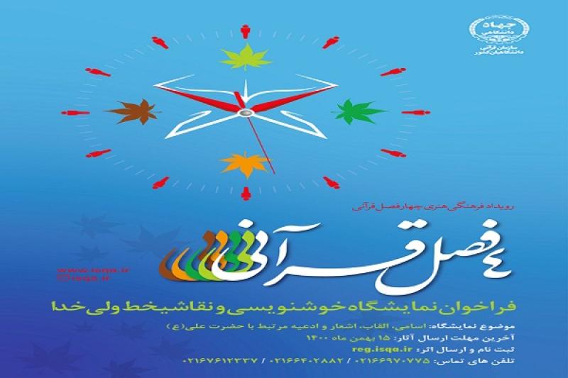 نمایشگاه ملی «ولی خدا» با موضوع اسامی، القاب، اشعار و ادعیه مرتبط با حضرت علی(ع)، در رشتههای خوشنویسی، نقاشیخط بهصورت مجازی و در پایگاه اینترنتی (سازمان قرآنی دانشگاهیان کشور) www.isqa.ir برگزار خواهد شد.