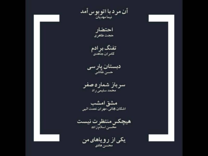 براساس این خبر، فیلمهای «آن مرد با اتوبوس آمد» به کارگردانی و تهیهکنندگی «نیما مهدیان»، «احتضار» به کارگردانی «حجت طاهری» و تهیهکنندگی «حجت طاهری، عبدالخالق طاهری»، «تفنگ برادرم» به کارگردانی و تهیهکنندگی «کامران جاهدی»، «دبستان پارسی» به کارگردانی و تهیهکنندگی «حسن نقاشی»، «سرباز شماره صفر» به کارگردانی و تهیهکنندگی «محمد سلیمیراد»، «مشق امشب» به کارگردانی و تهیهکنندگی «اشکان نجاتی، مهران نعمتالهی»، «هیچکس منتظرت نیست» به کارگردانی و تهیهکنندگی «محسن اسلامزاده»، «یکی از رویاهای من» به کارگردانی و تهیهکنندگی «محسن هادی» در این بخش حضور دارند.
