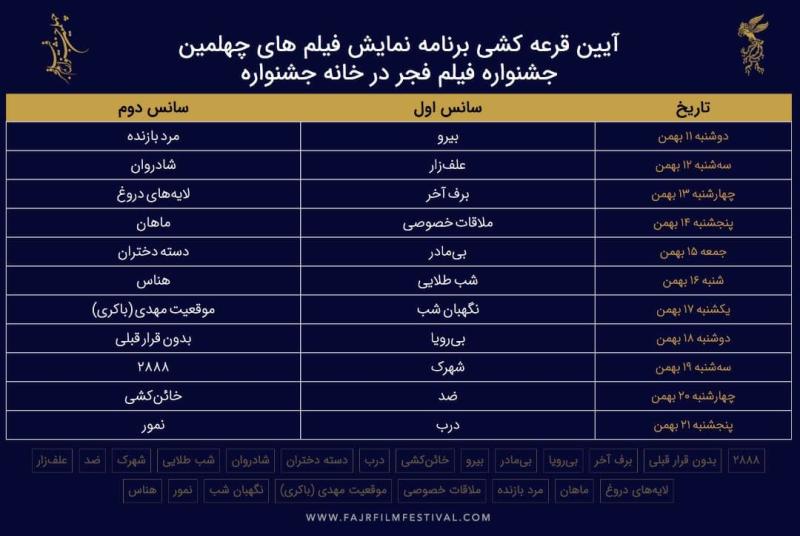 با انجام قرعه کشی جدول نمایش فیلم های چهلمین دوره جشنواره فیلم فجر، روز و ساعت نمایش فیلم های این دوره که قرار است در خانه جشنواره (برج میلاد) پخش شوند، مشخص گردید که به شرح تصویر زیر است.