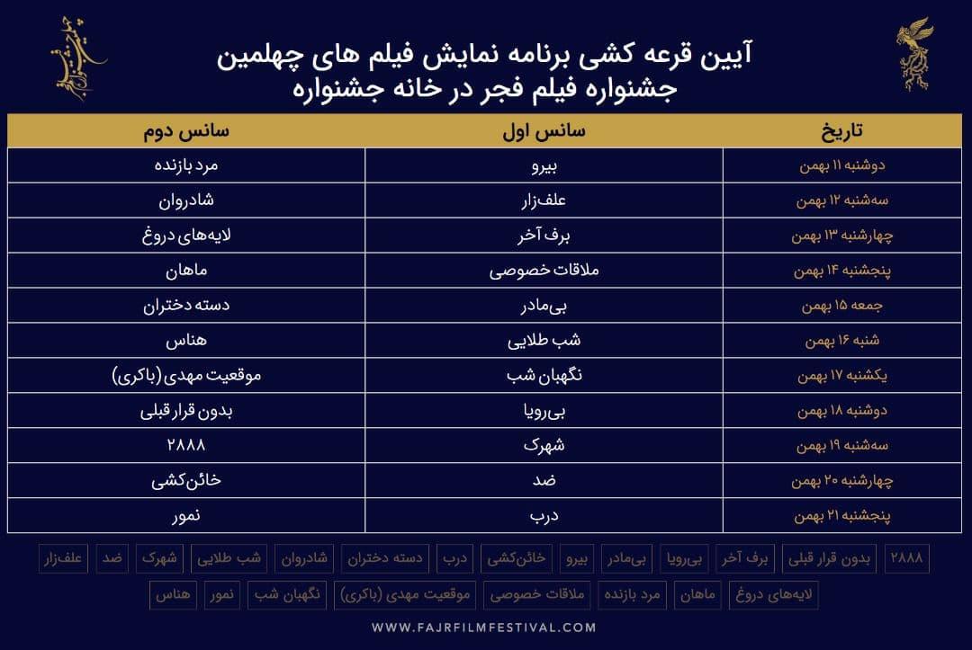 جدول نمایش فیلمهای چهلمین جشنواره فیلم فجر در خانه جشنواره