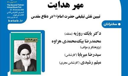 کتاب «مهر هدایت؛ تبیین نقش تبلیغی حضرت امام (ره) در دفاع مقدس» از سوی خانه کتاب و ادبیات ایران روز یکشنبه سوم بهمنماه معرفی و رونمایی میشود.