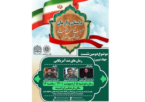 ویژه برنامهی «داستان و آرمان»؛ بازخوانی ادبیات داستانی پس از پیروزی انقلاب و جریانشناسی این شاخهی مهم و تأثیرگذار از فرهنگ کشورمان است که توسط فرهنگسرای اندیشه، با مشارکت پژوهشگاه فرهنگ و اندیشه اسلامی و با حضور اندیشمندان و اهالی قلم برگزار میشود. دومین جلسه از این ویژه برنامه به واکاوی رمانهای «ضد آمریکایی» میپردازد. همچنین محورهای اصلی اعتراض به سیاستهای آمریکا در ادبیات این کشور و رماننویسان شاخص مخالف با آمریکا معرفی خواهند شد. علاوه بر این، ریشههای تاریخی، اجتماعی و فرهنگی شکلگیری رمانهای ضدآمریکایی مورد بررسی قرار میگیرد.