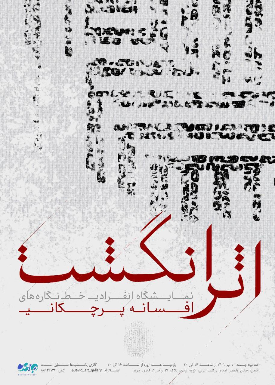 نمایشگاه اثر انگشت از جمعه ۱۰ تیر تا ۱۷ تیر از ساعت ۱۶ تا ۲۰ ادامه دارد. گالری یکشنبه ها تعطیل است. آدرس گالری جاوید: خیابان ولیعصر، ابتدای زرتشت غربی، خیابان یزدان، پلاک 17 واحد یک.