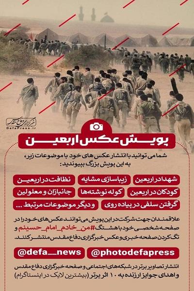 علاقهمندان جهت شرکت در این پویش میتوانند عکسهای خود را در صفحه شخصی خود با # من _خادم _ امام_ حسینم و تگ کردن صفحه خبری و عکس خبرگزاری دفاع مقدس منتشر کنند. تصاویر برتر در شبکههای اجتماعی و صفحه خبرگزاری دفاع مقدس منتشر و به ۱۰ اثر برتر جوایز ارزندهای اهدا خواهد شد. پویش عکس اربعین، تلاشی است برای ثبت چهره میلیونها زائر مشتاق تا عظمت این حماسه را در قالب نمایشگاهی بزرگ به رخ جهانیان بکشانیم.