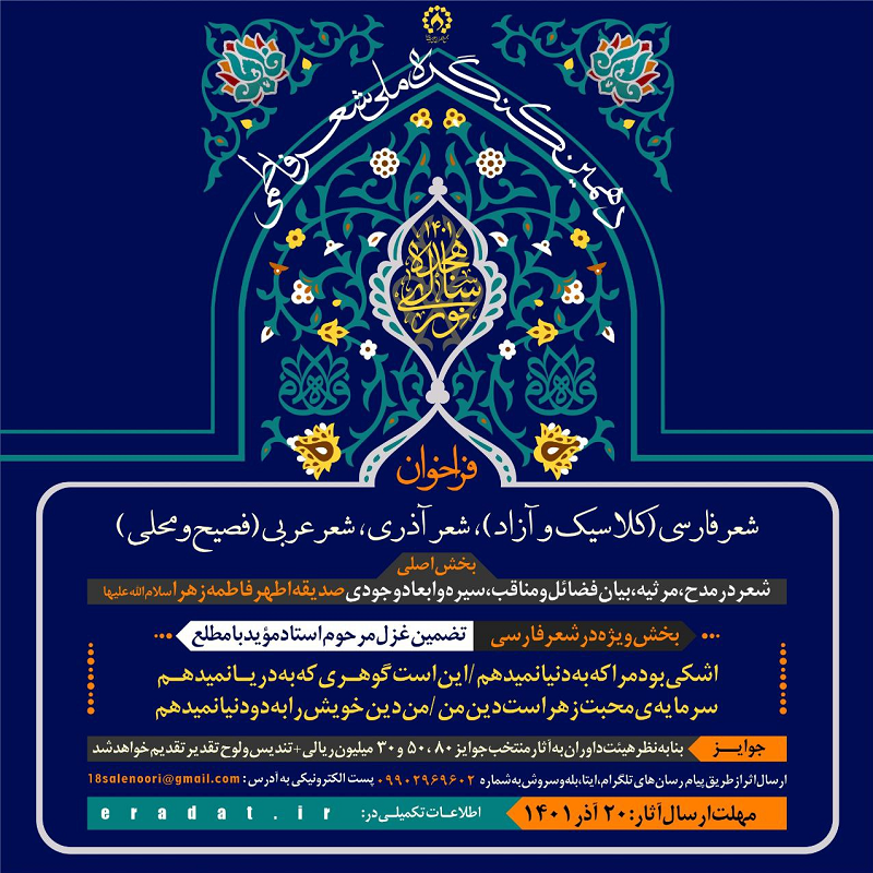 مجمع شاعران اهل بیت (ع) فراخوان دهمین کنگره سراسری شعر فاطمی «هجده سال نوری» را در بخشهای شعر فارسی (کلاسیک و آزاد)، شعر عربی (فصیح و محلی) و شعر آذری اعلام کرد.