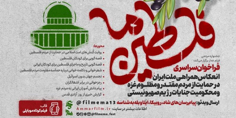 بخش «فیلم ما» جشنواره مردمی فیلم عمار برای انعکاس همراهی ملت ایران در حمایت از مردم مقتدر و مظلوم غزه و همچنین محکومیت جنایات رژیم صهیونیستی، فراخوان سراسری «فلسطین ما» را در ۹ محور برگزار میکند.