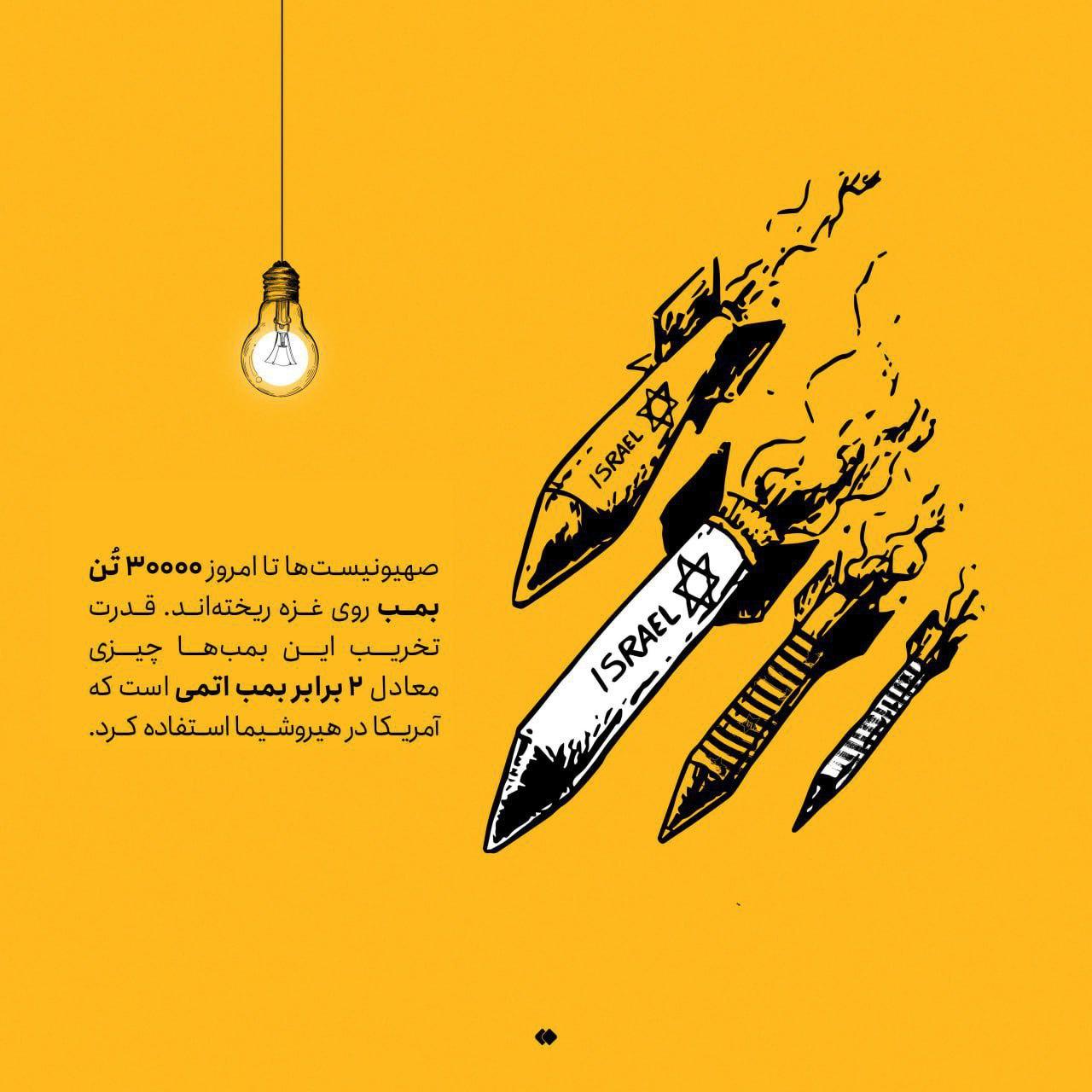 صهیونیست ها تا امروز 30000 تن بمب روی غزه ریخته اند. قدرت تخریب این بمب ها چیزی معادل 2برابر بمب اتمی است که آمریکا در هیروشیما استفاده کرد.
