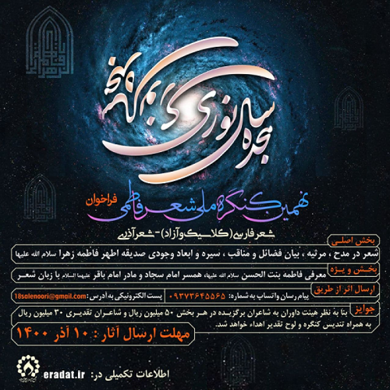 نهمین کنگرهی سراسری شعر فاطمی «هجده سال نوری» که به همت مجمع شاعران اهل بیت (علیهالسلام) برگزار میشود، در حوزههای شعر فارسی (کلاسیک و آزاد)، شعر عربی (فصیح و محلی) و شعر آذری فراخوان داد. بخش اصلی این کنگره شامل شعر فاطمی (مدح، مرثیه، فضائل، مناقب، زندگانی و ابعاد وجودی حضرت زهرا (سلاماللهعلیها)) و موضوع ویژهی کنگره نیز معرفی علیا مخدره فاطمه بنتالحسن (سلاماللهعلیها)، همسر امام سجاد و مادر امام باقر علیهماسلام با زبان شعر است.