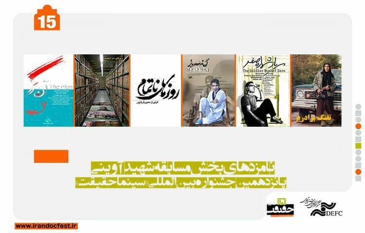 در بخش مسابقه شهید آوینی، مستندهای «آن مرد» (مهدی حجتپناه)، «روزهای ناتمام» (مهدی قربانپور)، «سرباز شماره صفر» (محمد سلیمیراد)، «تفنگ برادرم» (کامران جاهدی)، «کهنه سرباز» (جابر مطهریزاده) و «زندگی در آرشیو» (برهان احمدی) نامزد دریافت جایزه مسابقه شهید آوینی هستند.