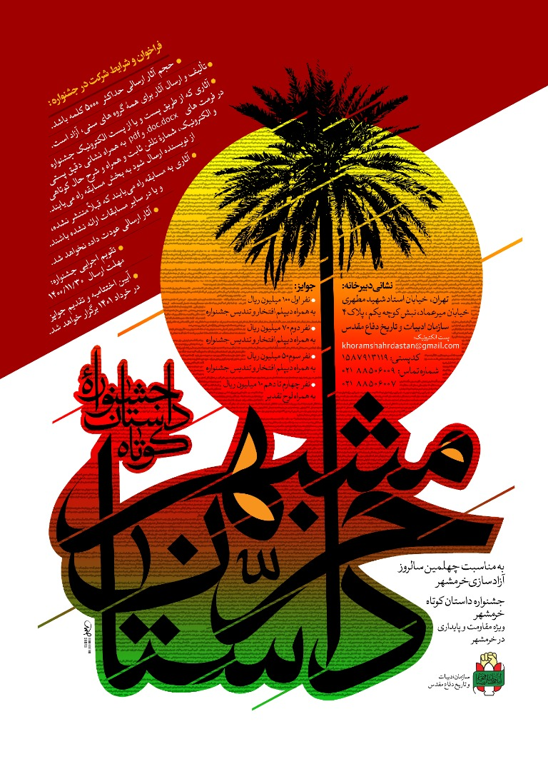 جشنوارهی «داستان خرمشهر» به مناسبت چهلمین سالروز آزادسازی این شهر در دوران دفاع مقدس با رویکرد داستان کوتاه ویژهی مقاومت و پایداری در خرمشهر برگزار میشود. مهلت ارسال آثار تا 30 بهمنماه بوده و حجم آثار ارسالی به این جشنواره حداکثر باید ۵۰۰۰ کلمه باشد و تألیف و ارسال آثار برای همهی گروههای سنی، آزاد است.