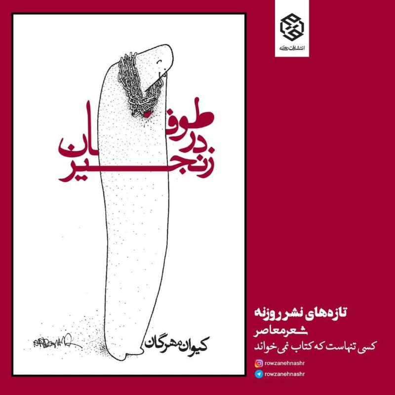 او کوشیده راوی رنج های انسان عاصی معاصر باشد. از کیوان مهرگان پیشتر، مجموعه شعرهای «تو و جاده همدستید»، «دهانم بوی مریم میدهد»، «عاشق لونرفته»، «من سکوت انسانم» و «موهایت باد را نجات خواهند داد» منتشر شده است. «طوفان در زنجیر» در 144 صفحه در قطع پالتویی و توسط نشر روزنه منتشر شده است.