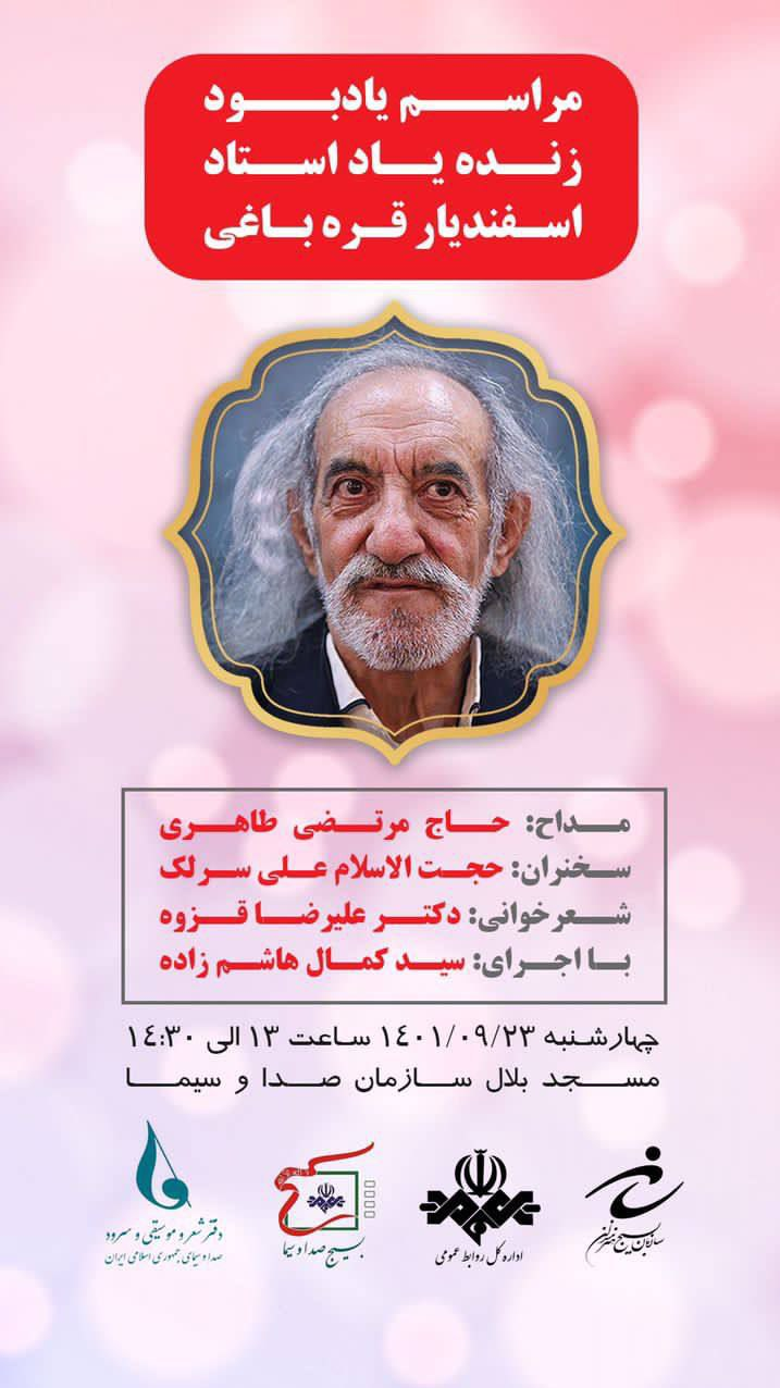 مراسم یادبود مرحوم اسفندیار قرهباغی خواننده نواهای ماندگار حماسی و انقلابی ازجمله «آمریکا آمریکا ننگ به نیرنگ تو» با حضور اهالی فرهنگ و هنر در مسجد بلال سازمان صدا و سیما برگزار میشود.