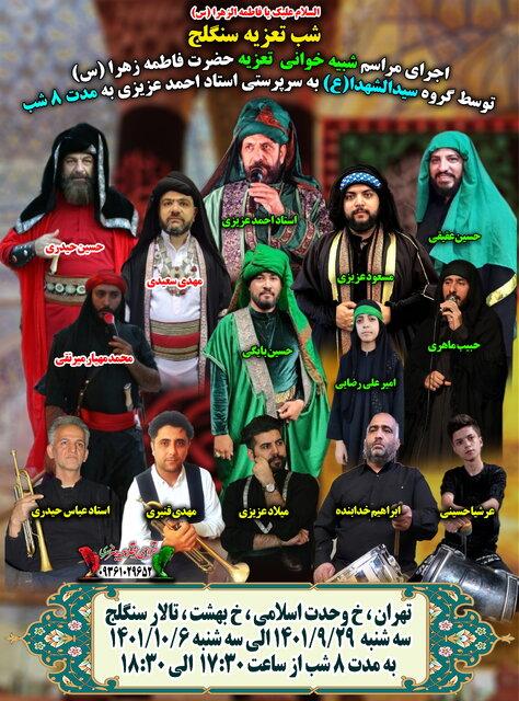 محلس تعزیهخوانی حضرت زهرا (س) از روز سه شنبه ۲۹ آذر تا سه شنبه ۶ دی هر روز راس ساعت ۱۷ و سی دقیقه در تماشاخانه سنگلج اجرا میشود.