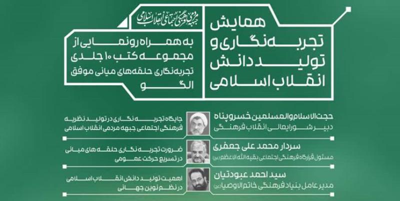 همایش تجربهنگاری و تولید دانش انقلاب اسلامی به همراه رونمایی از مجموعه کتب ۱۰ جلدی تجربهنگاری حلقههای میانی موفق سهشنبه دوم اسفندماه ۱۴۰۱ در میدان فلسطین، سالن همایش کوثر واقع در مسجد امام صادق (ع) برگزار میشود.