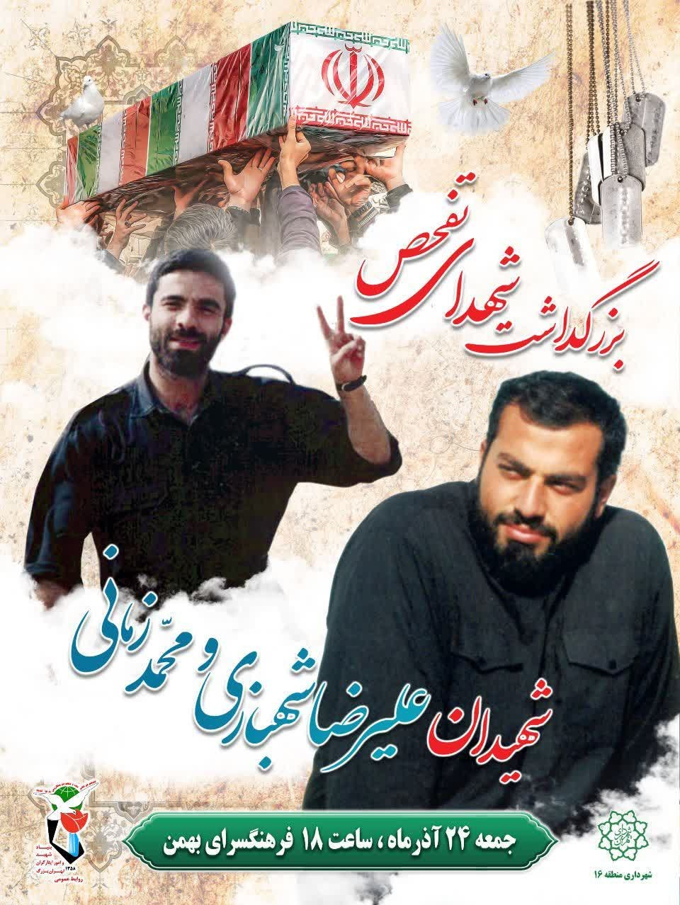 مراسم بزرگداشت شهیدان تفحص علیرضا شهبازی و محمد زمانی، جمعه همین هفته در فرهنگسرای بهمن تهران برگزار میشود.