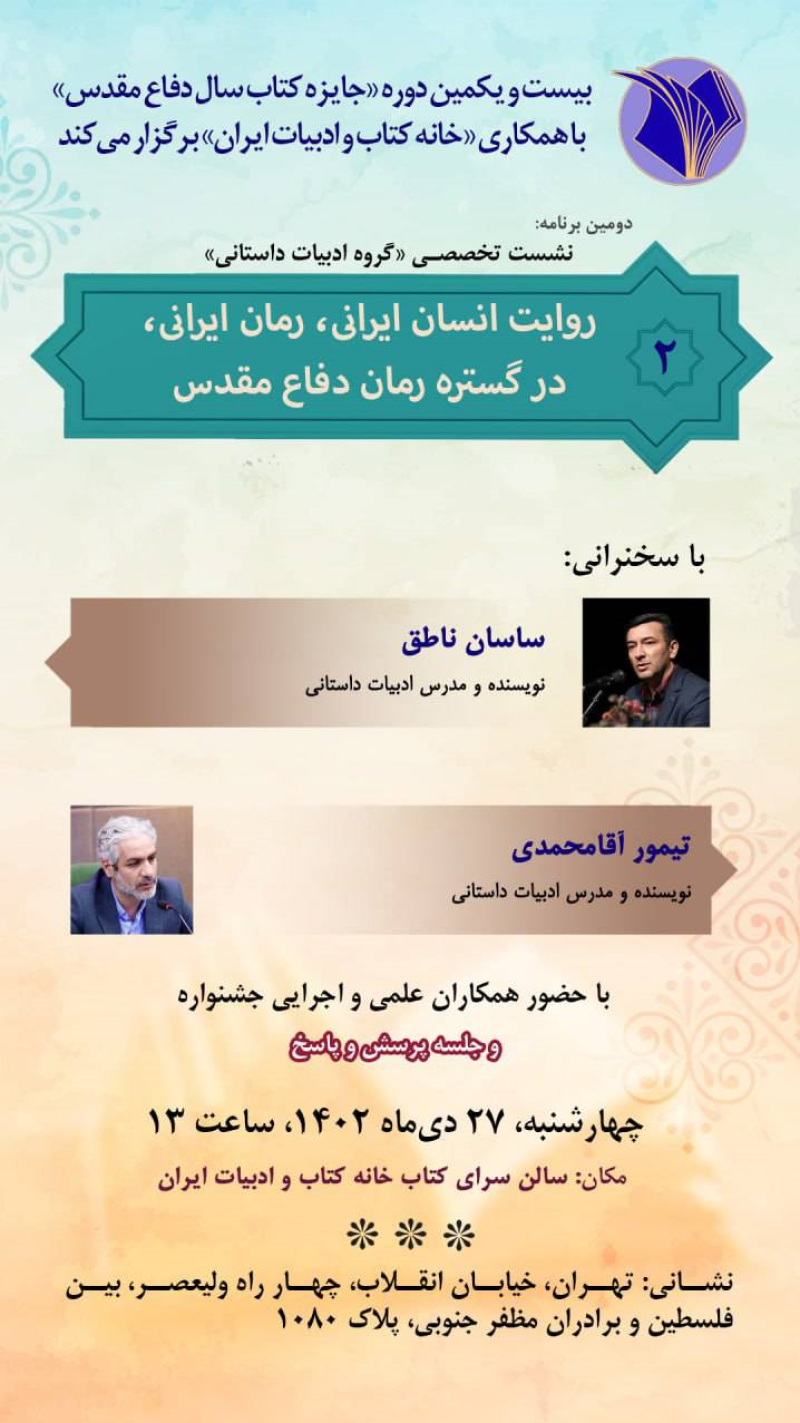 نشست روایت انسان ایرانی و رمان ایرانی در گستره رمان دفاع مقدس ساعت ۱۳ روز چهارشنبه ۲۷ دیماه در سالن سرای کتاب خانه کتاب و ادبیات ایران واقع در تهران، خیابان انقلاب، چهارراه ولیعصر، بین خیابانهای فلسطین و برادران مظفر جنوبی، پلاک ۱۰۸۰ برگزار میشود.
